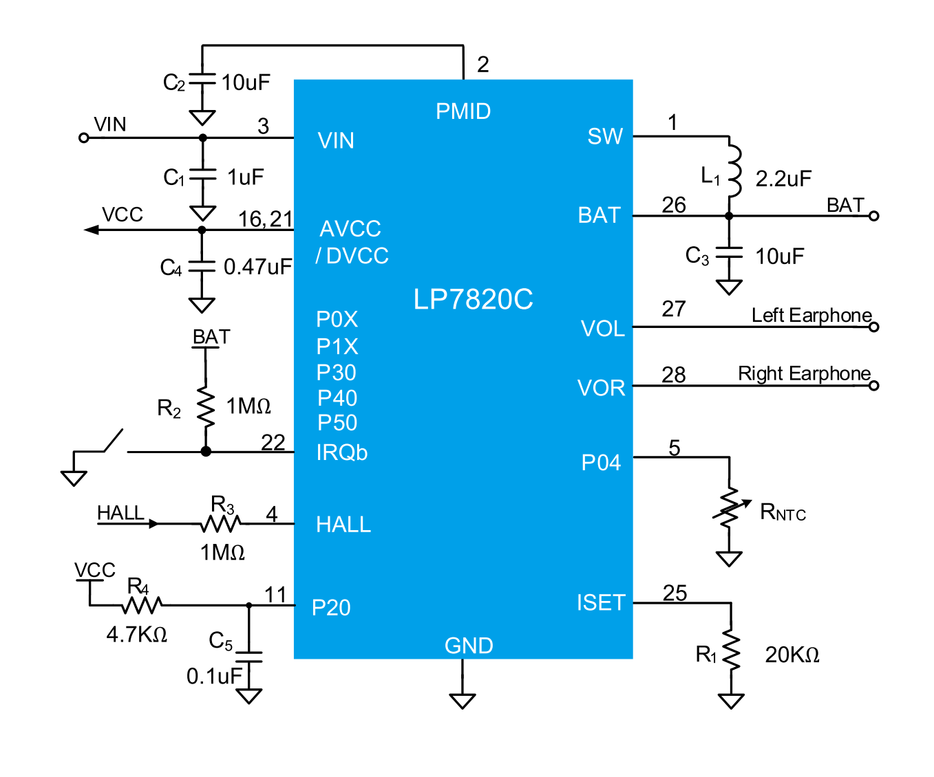 The LP7820C is a fully integrated TWS charging case solution with MCU, charger, boost and load switches. The LP7820C has built-in an 8-bit MCU core with up to 32K -byte flash and 1K-byte RAM. A low on-resistance BUS-FET is integrated to manage the input power from the VIN pin. A bidirectional buck or boost converter is integrated to manage charging and discharging of the battery. The buck charger supports up to 1A charging current with up to 95% efficiency. The ultra-low quiescent current boost converter consumes less than 2μA quiescent current and supports up to 0.6A output current. Two independent load switches feature earphone insert detection, removal detection and provide power from the PMID pin to the VOL pin and VOR pin with ultra-low voltage drop. An NTC circuit is offered to manage the temperature range that charging or discharging is allowed. The LP7820C offers power path management that allows the system to be powered up with a fully-discharged battery. It can dynamically manage the power from the VIN input and the battery to meet the system loading needs. The LP7820C support ship mode and support three methods to exit ship mode.