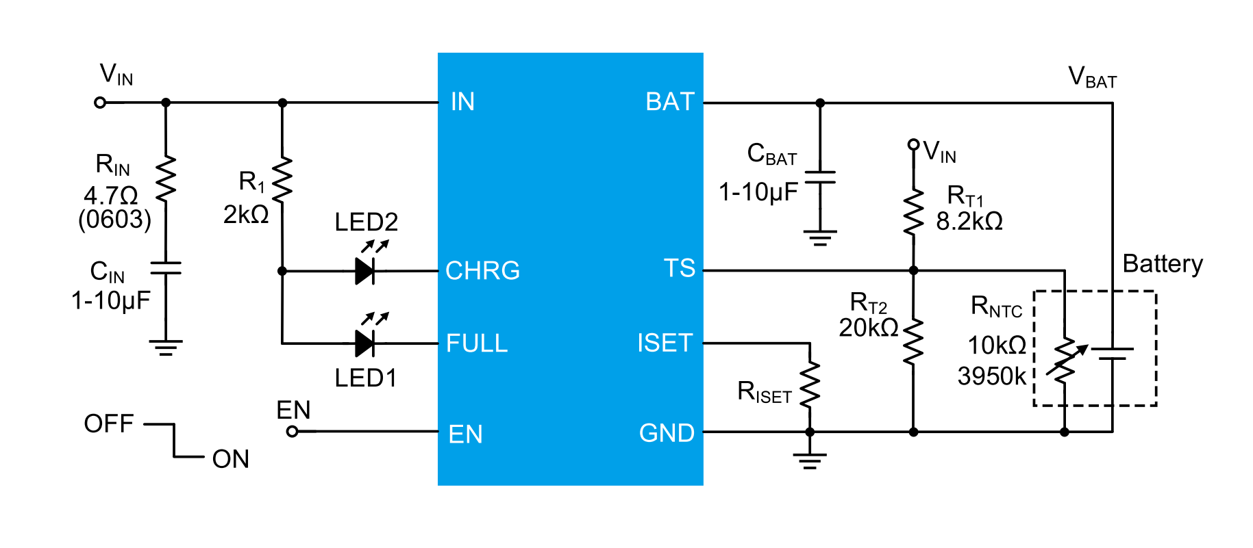 The device employs a full charge algorithm with trickle current, constant current (CC), constant voltage (CV) modes, charge termination and automatic recharge. The device supports charge current up to 1A, programmed by an external resistor. The device can withstand an input voltage up to 36V, which can protect the charger from any accidental insertion of a high-voltage supply or a hot insertion. The device can withstand a BAT voltage up to 14V, which is suited for power battery applications. Without an input supply, the battery leakage current is only 30nA typical.