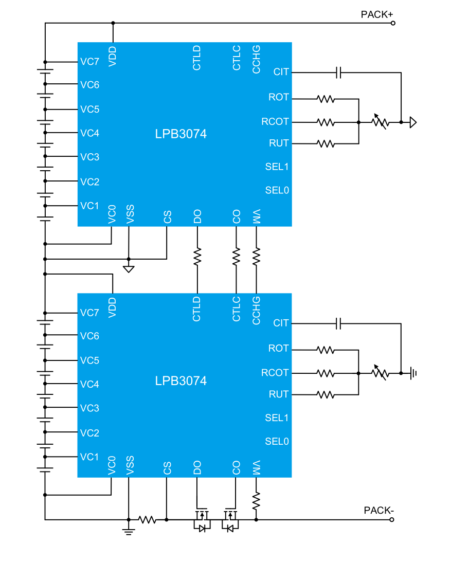 LPB3074系列是一款专用于4-7串锂离子电池或锂聚合物电池组的低功耗保护芯片,内部集成了高精度电压检测电路,电流检测电路,温度检测电路,两个N沟道MOSFET的驱动,电池被动均衡电路,负载检测和充电器检测电路等。通过检测每串电池的电压、充放电电流、温度等信息,控制外部充放电MOSFET,实现电池过充电、过放电、充电过流、放电过流、短路,电池充放电高温等保护功能。