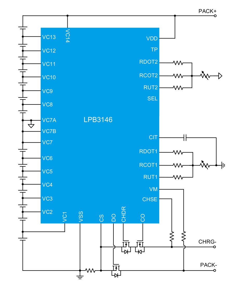 LPB3146系列是一款专用于13~14串锂离子电池或锂聚合物电池组的低功耗保护芯片,内部集成了高精度电压检测电路 , 电流检测电路, 温度检测电路 , 两个N沟道MOSFET的驱动,电池被动均衡电路,负载检测和充电器检测电路等。通过检测每串电池的电压、充放电电流、温度等信息,控制外部充放电MOSFET,实现电池过充电、过放电、充电过流、放电过流、短路,电池充放电高温等保护功能。