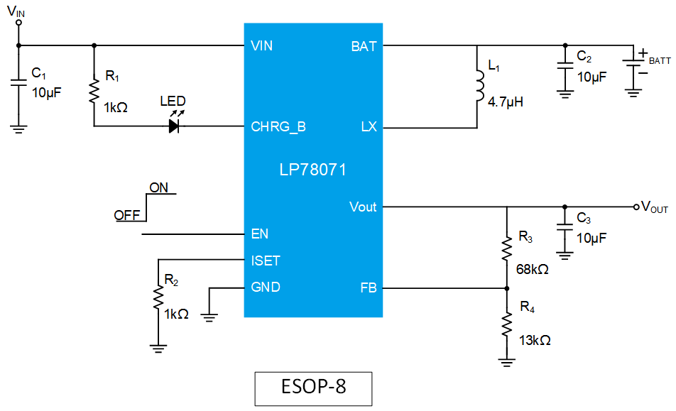 The LP78071 is a PMIC,which has 1ch Charger and 1ch Synchronous Boost Converter with ESOP-8 and TDFN10 package.