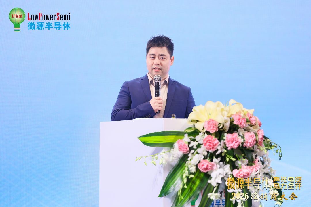 微源半导体董事长戴兴科致辞,向长期以来并肩前行的经销商伙伴致以诚挚谢意,全面回顾2025年双方携手取得的丰硕成果 ,每一份成绩都凝聚着彼此的信任与坚守。同时发布2026年核心市场策略,从战略布局、渠道支持、市场开拓等方面为未来发展锚定清晰方向,为全体合作伙伴注入强大发展动力。